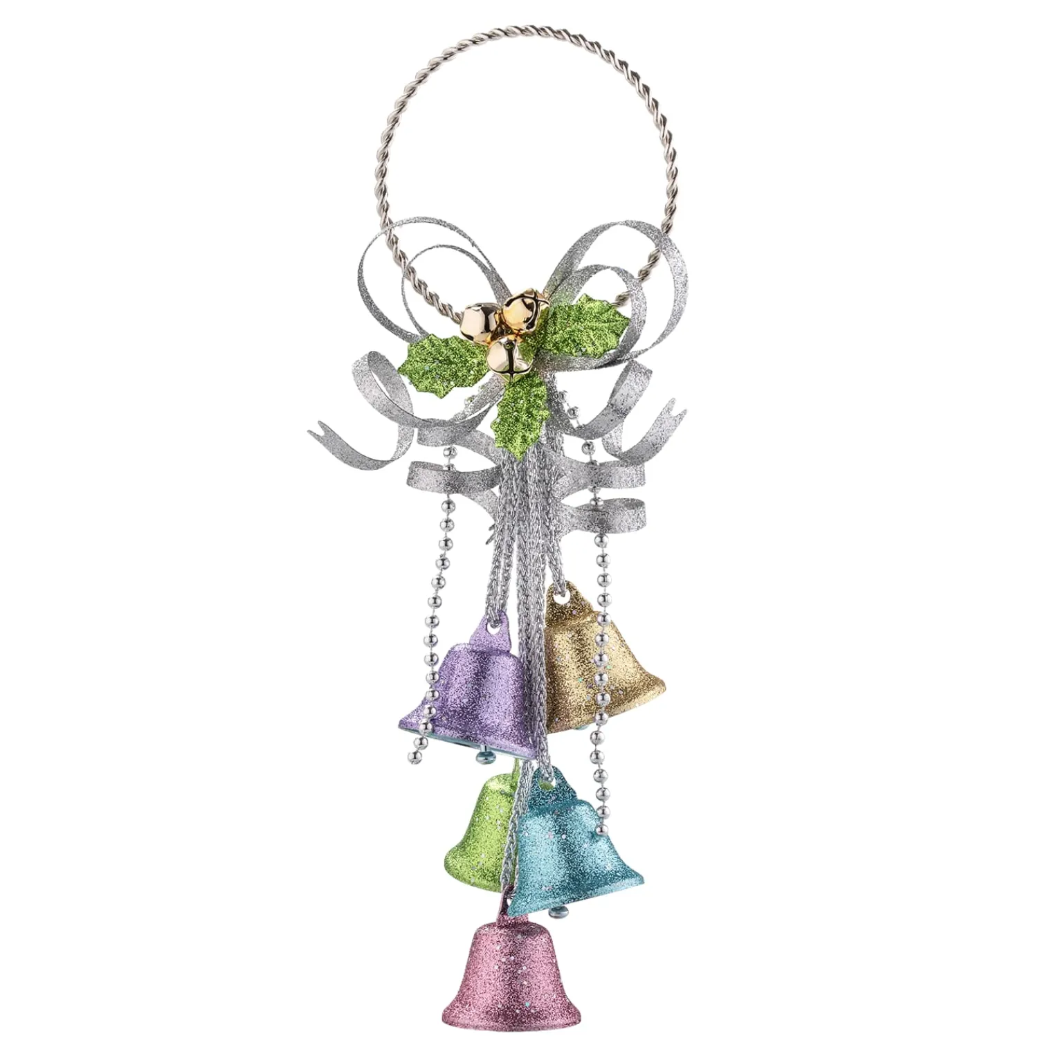 - mit silberner Schleife, grünen Blättern und bunten Glöckchen