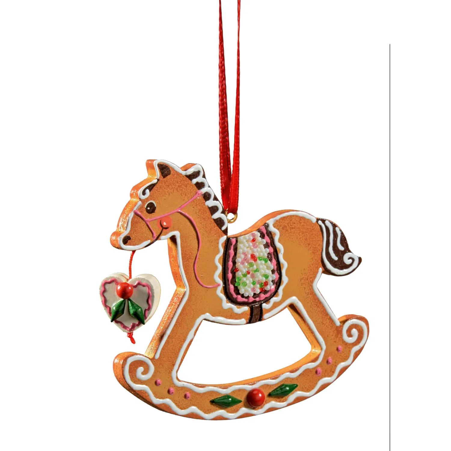 Dieses liebevoll gestaltete Schaukelpferd aus Holz weckt durch das Lebkuchendesign die Erinnerungen an festlich geschmückte Weihnachtsbäume und schöne Kindheitsträume. Mit seiner kunstvollen Verzierung, dem kleinen Herz am Zügel und den klassischen Farben strahlt es wohltuende Wärme und eine Prise Weihnachtsfantasie aus. Ein bezaubernder Baumbehang für alle, die das Besondere suchen – und ihrem Christbaum eine liebevolle Note von Handwerkskunst und Nostalgie verleihen möchten.