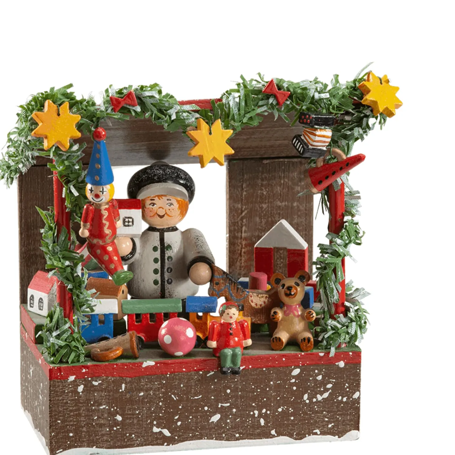 Farbenprächtige Spielwaren werden in diesem weihnachtlich dekorierten Verkaufshäuschen angeboten. Beim Bummel über den Weihnachtsmarkt und auf der Suche nach einem passenden Geschenk für Lisa und Tim wird man hier fündig werden. Ball, Puppe, Teddybär, Spielzeuglokomotive, Bausteine, Spielhäuschen und Instrumente bietet der nette Händler feil. Was stand da nochmal auf dem Wunschzettel der Kinder?