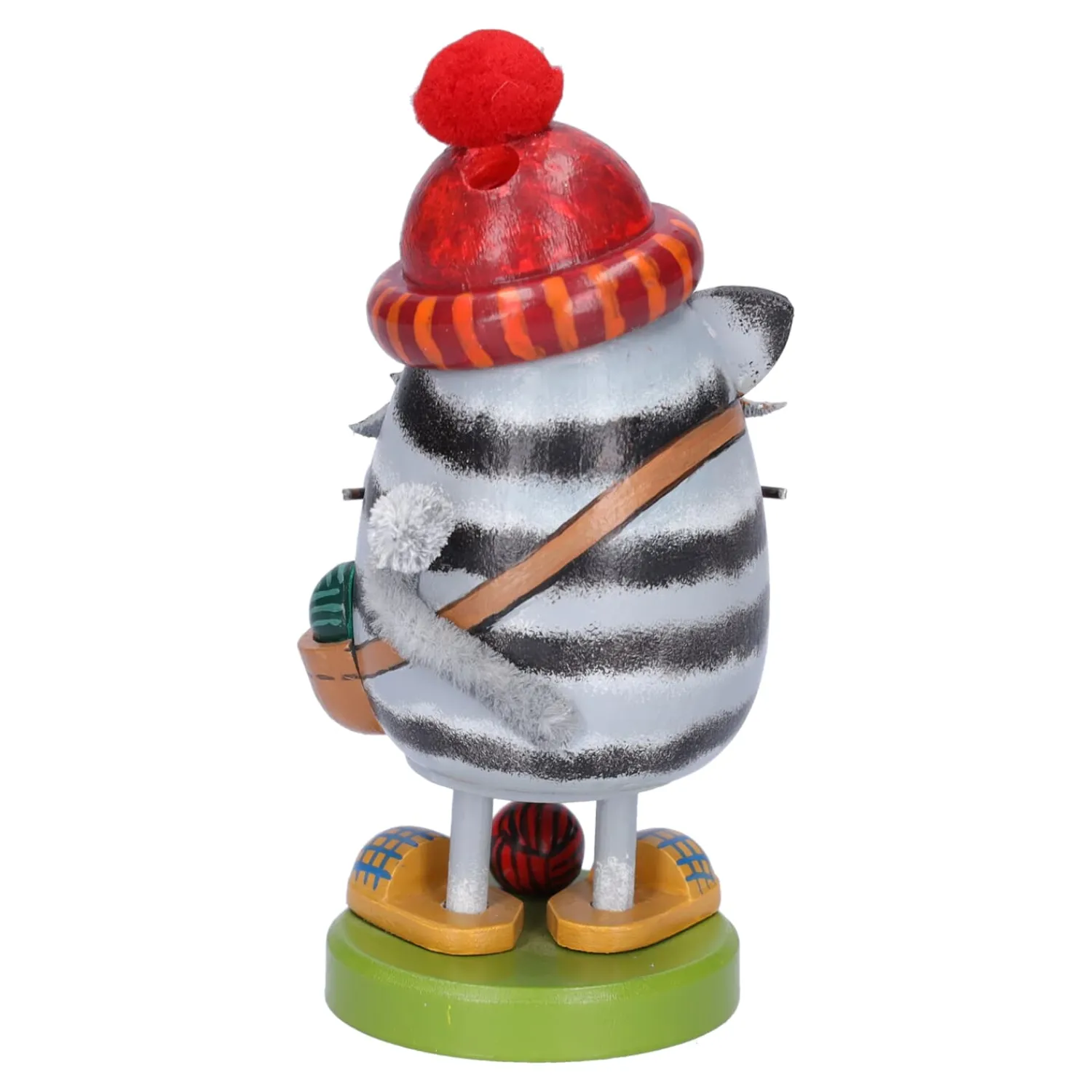 Das niedliche graue Kätzchen trägt eine rote Bommelmütze und hält ihr Strickwerkzeug in den Pfoten. Für wen sie den Schal wohl strickt?