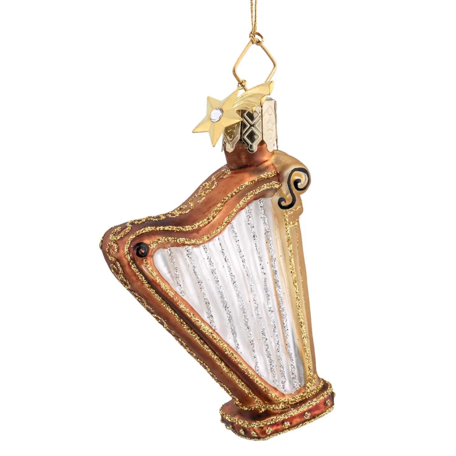Mit goldfarbenen Verzierungen, silberfarbenen Saiten und liebevoll von Hand aufgetragenen Details bringt die mundgeblasene Harfe eine leise, funkelnde Note an den Weihnachtsbaum – ein zauberhafter Blickfang für alle, die Musik und festliche Ästhetik gleichermaßen lieben.