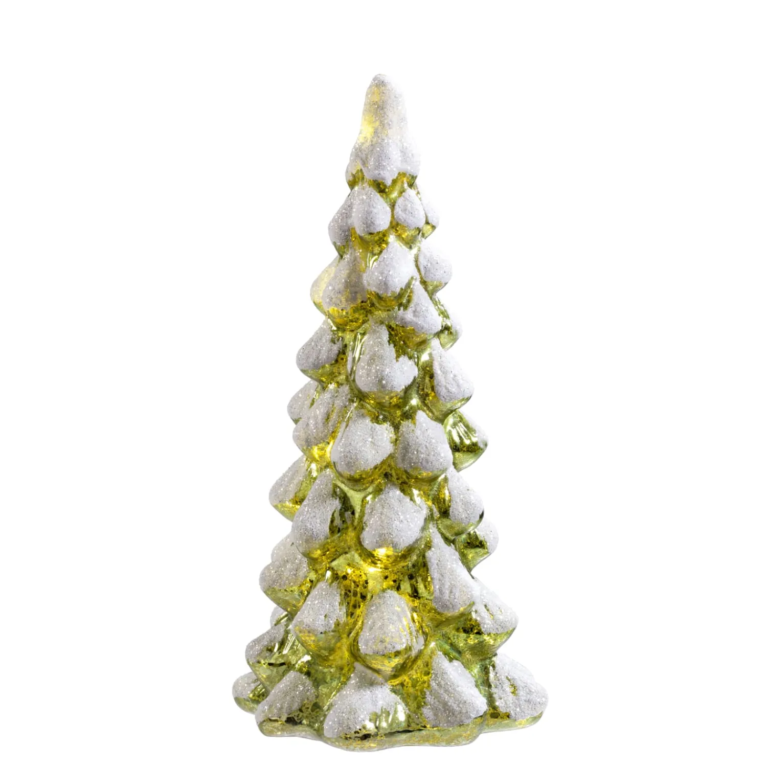 Die schneebedeckte Tanne funkelt wunderschön im Licht und rundet die Weihnachtsdekoration perfekt ab.