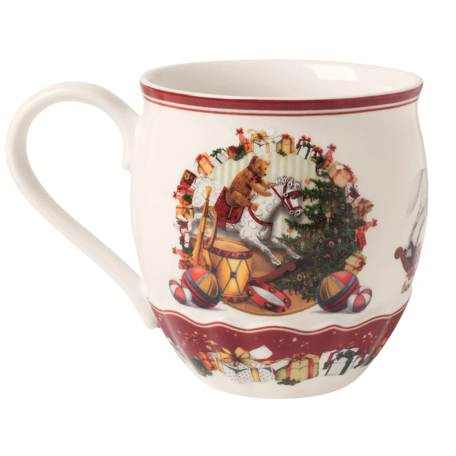 Diese weihnachtliche Tasse aus der Serie Toy’s Fantasy von Villeroy & Boch erzählt mit liebevollen Details von der Magie des Festes: Inmitten von Geschenken, glänzenden Instrumenten und einem festlich geschmückten Baum prüft der Weihnachtsmann mit liebevollem Blick die Wunschzettel der Kinder. Auf der anderen Seite erwacht ein nostalgisches Spielzimmer zum Leben. Ein Teddybär reitet auf einem Schaukelpferd, Trommeln und Kugeln liegen bereit, und der Weihnachtsbaum glänzt im Hintergrund.