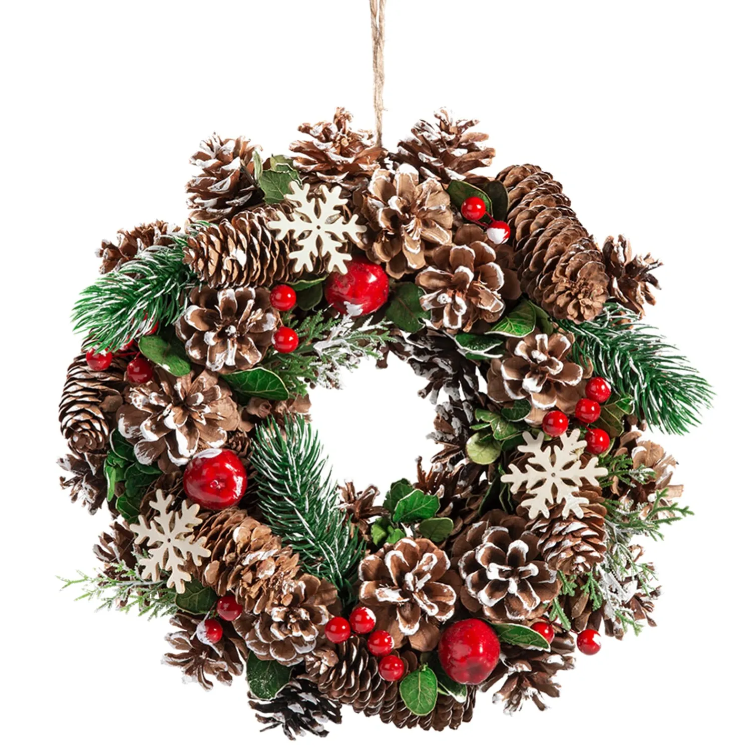 Die grünen Zweige mit den roten Beeren und Zapfen in Kombination mit den zierlichen Schneeflocken zaubern eine weihnachtliche Atmosphäre. Damit ist dieser Kranz ein schöner Blickfang für die Tür.