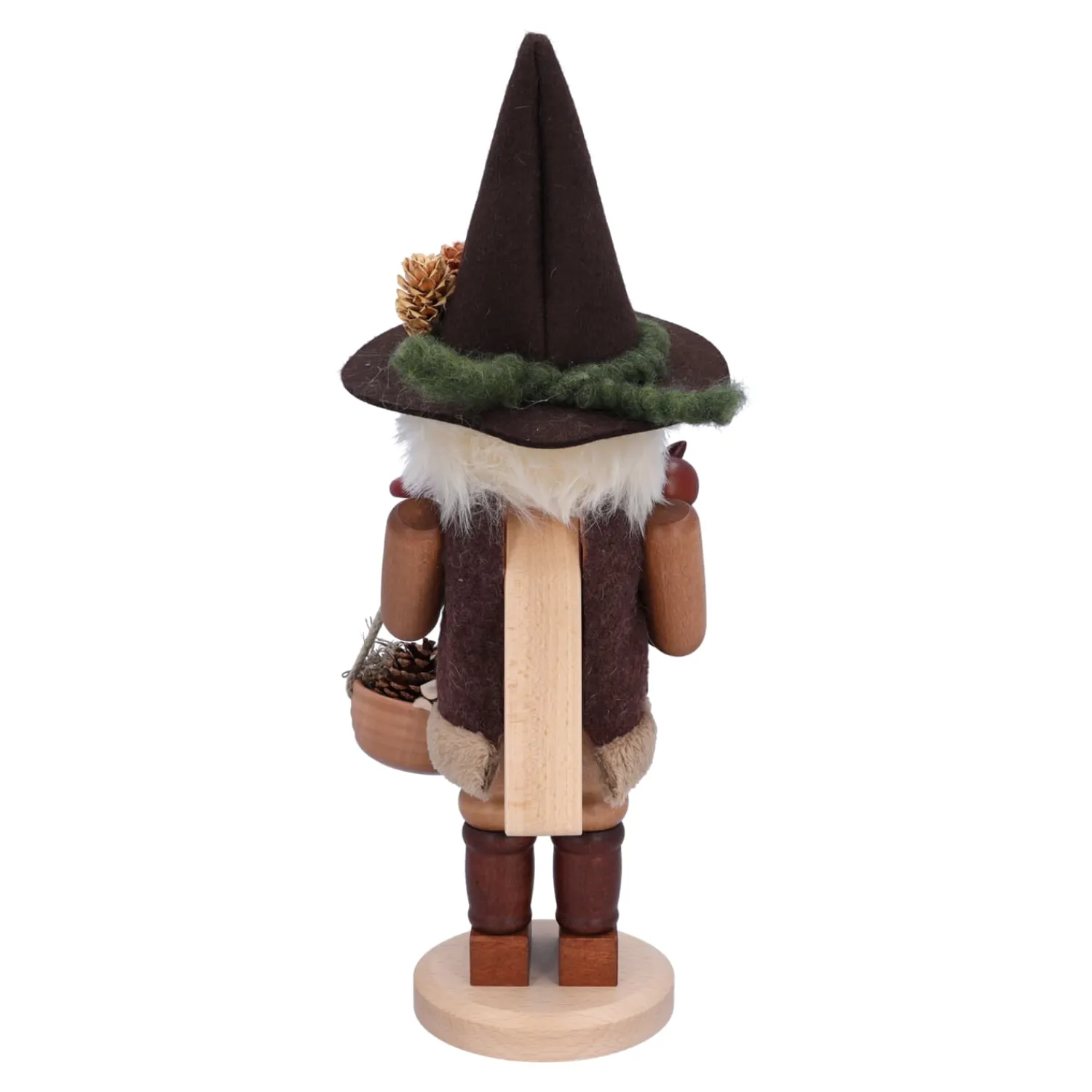 Mit wachem Blick und einer kleinen Eule auf dem Arm bringt dieser Waldmann die stille Kraft der Natur in die Weihnachtszeit. Der braune Filzhut mit Zapfen, der Korb voller Waldschätze und der leuchtend rote Pilz in der Hand lassen an die besondere Ruhe und Klarheit eines winterlichen Waldes denken.