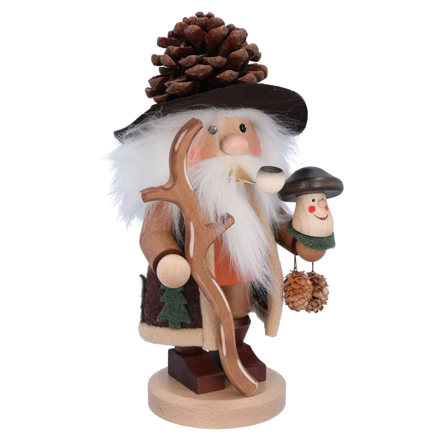 Mit seinem kräftigen Wanderstock in der einen Hand und dem fröhlichen Pilzgesellen in der anderen strahlt dieser Waldmann aus Holz eine tiefe Naturverbundenheit und lebensfrohe Gelassenheit aus. Die kleinen Tannenzapfen, der warme Mantel und der markante Zapfenhut erzählen von der stillen Schönheit der Winterzeit.