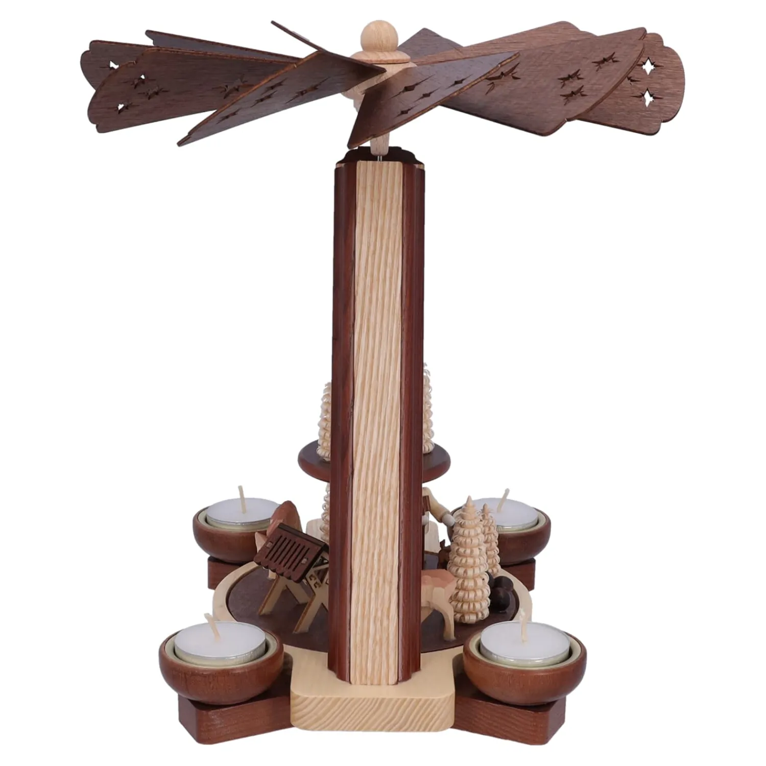 Eine der schönsten Weihnachtstraditionen sind Pyramiden und die Geschichten die sie erzählen. Das durch Kerzenwärme angetriebene Flügelrad zaubert ein wunderbares Spiel aus Licht und Schatten an Decken und Wände.