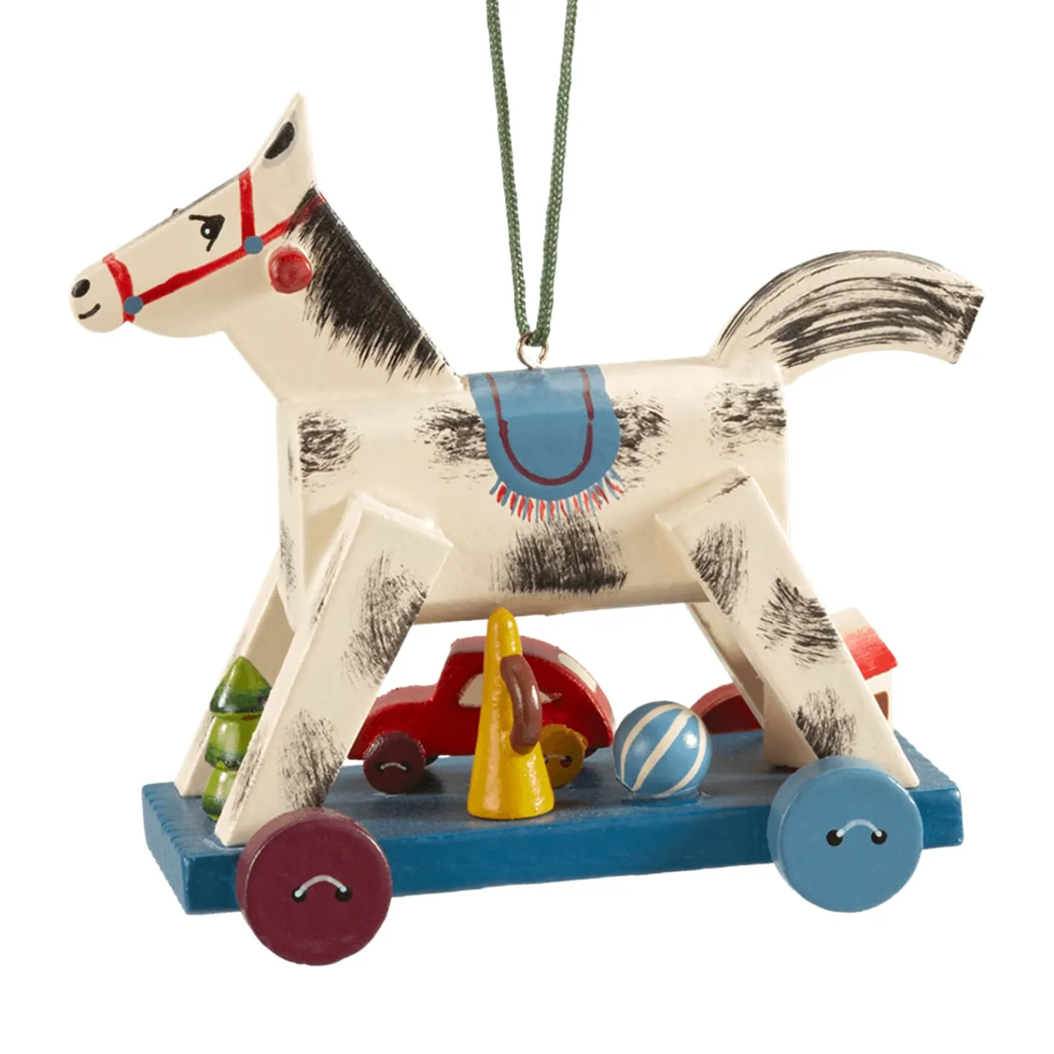 Endlich haben wir die Gelegenheit uns unseren Kindheitswunsch zu erfüllen. Das schöne kleine Schaukelpferd trägt schon sein festliches rotes Zaumzeug und seine blaue Satteldecke. Die kleinen bunten Knöpfe aus Holz wirken wie kleine Räder. Unter dem Spielzeugpferd stehen weitere kleine Spielsachen. Die vielen kleinen liebevollen Details lassen das Ornament realistisch wirken, so dass es Ihnen viele Jahre Freude bereitet.