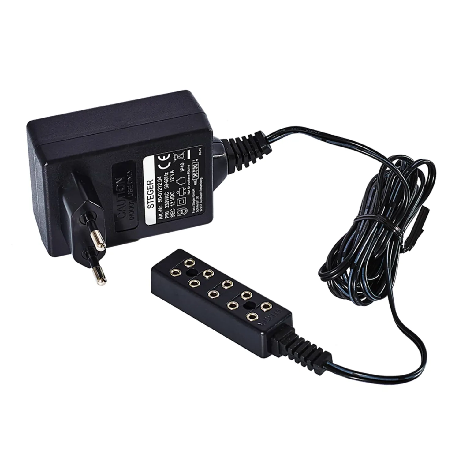 Beleuchtungs-Transformator mit Verteiler zum direkten Anschluss von 12V-Lämpchen.