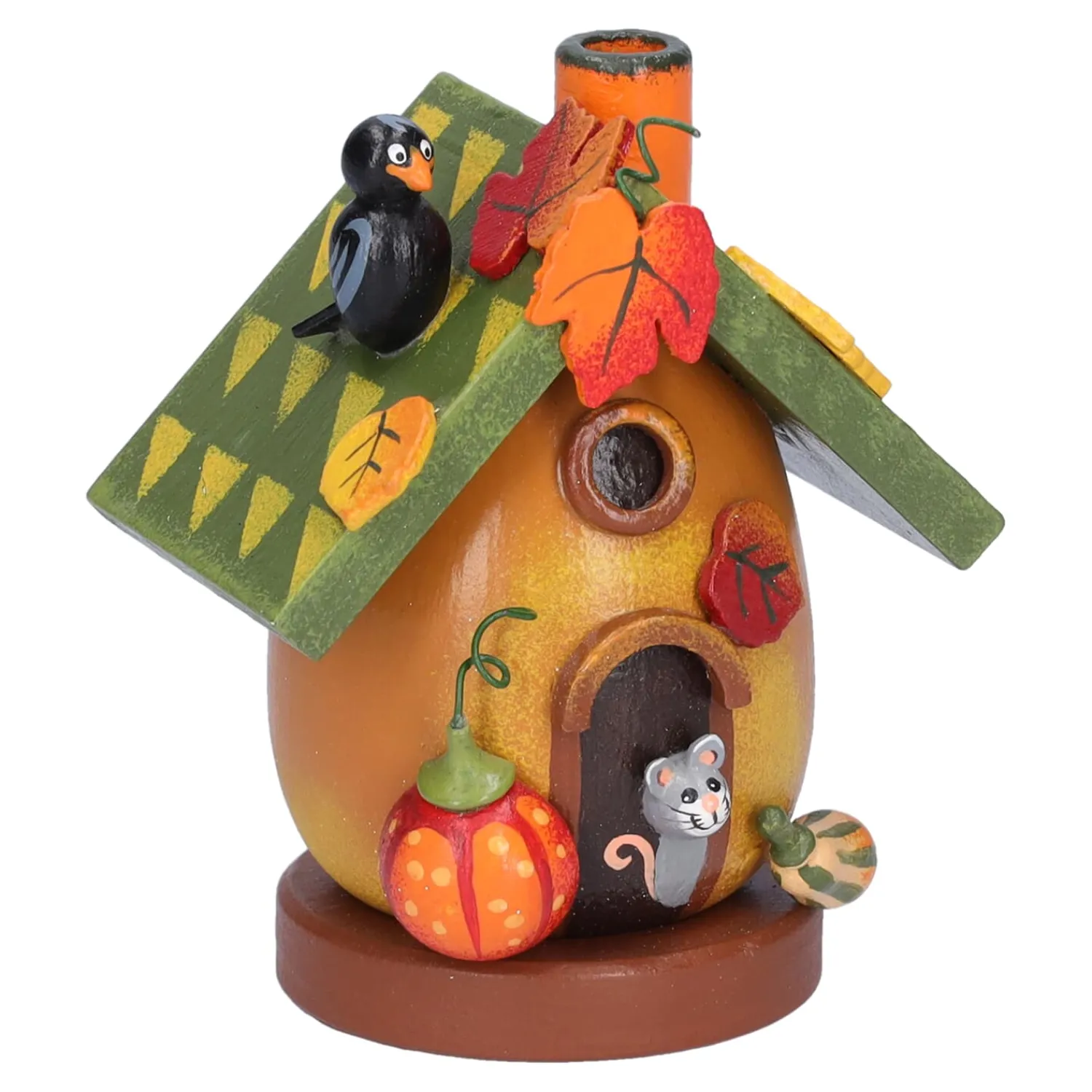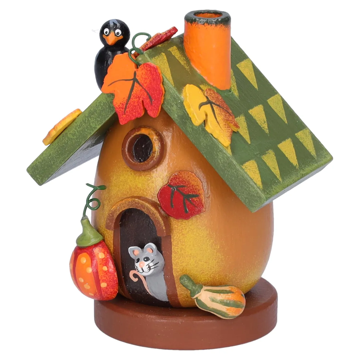 Liebevoll ist es mit herbstlichen Blättern und Kürbissen gestaltet. Ein kleines Mäuschen spitzt keck aus dem Türchen und hält Ausschau nach seinen Vogelfreunden.
