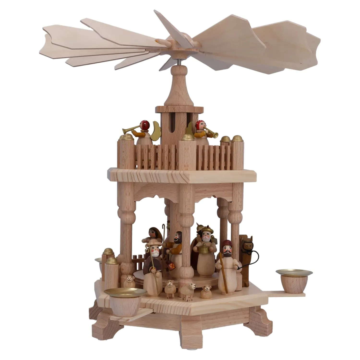 Eine der schönsten Weihnachtstraditionen aus dem Erzgebirge sind Pyramiden und die Geschichten die sie erzählen. Das durch Kerzenwärme angetriebene Flügelrad zaubert ein wunderbares Spiel aus Licht und Schatten an Decken und Wände.