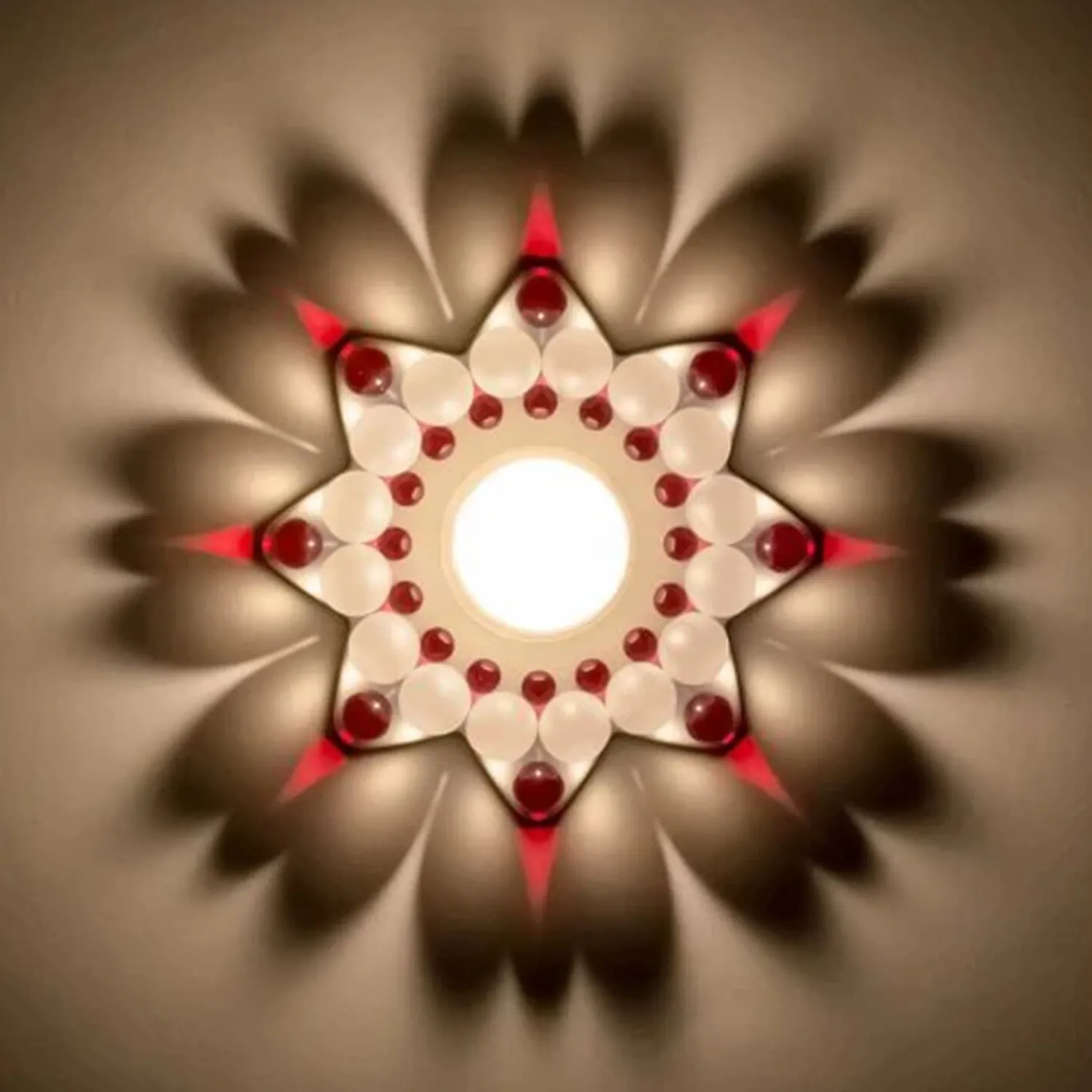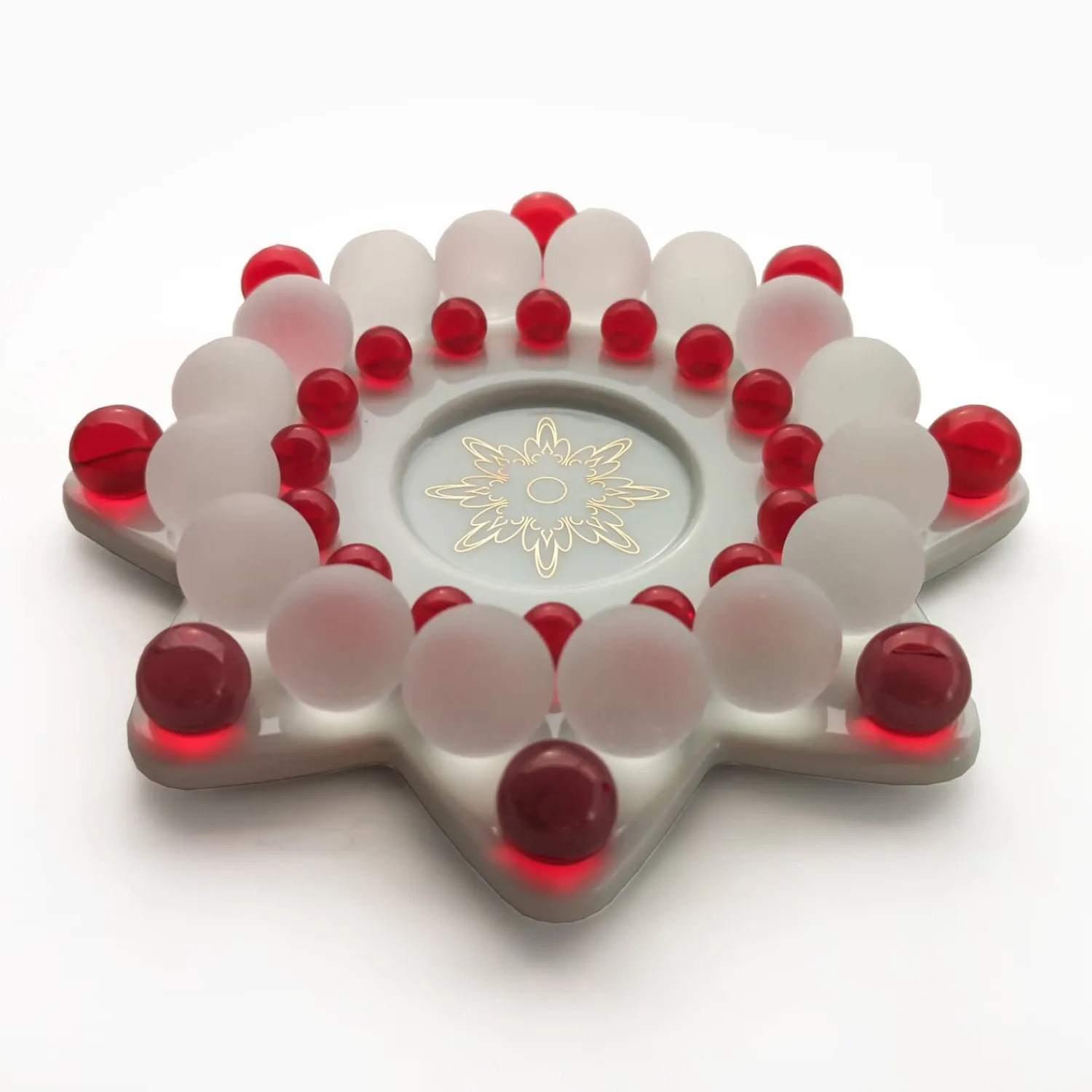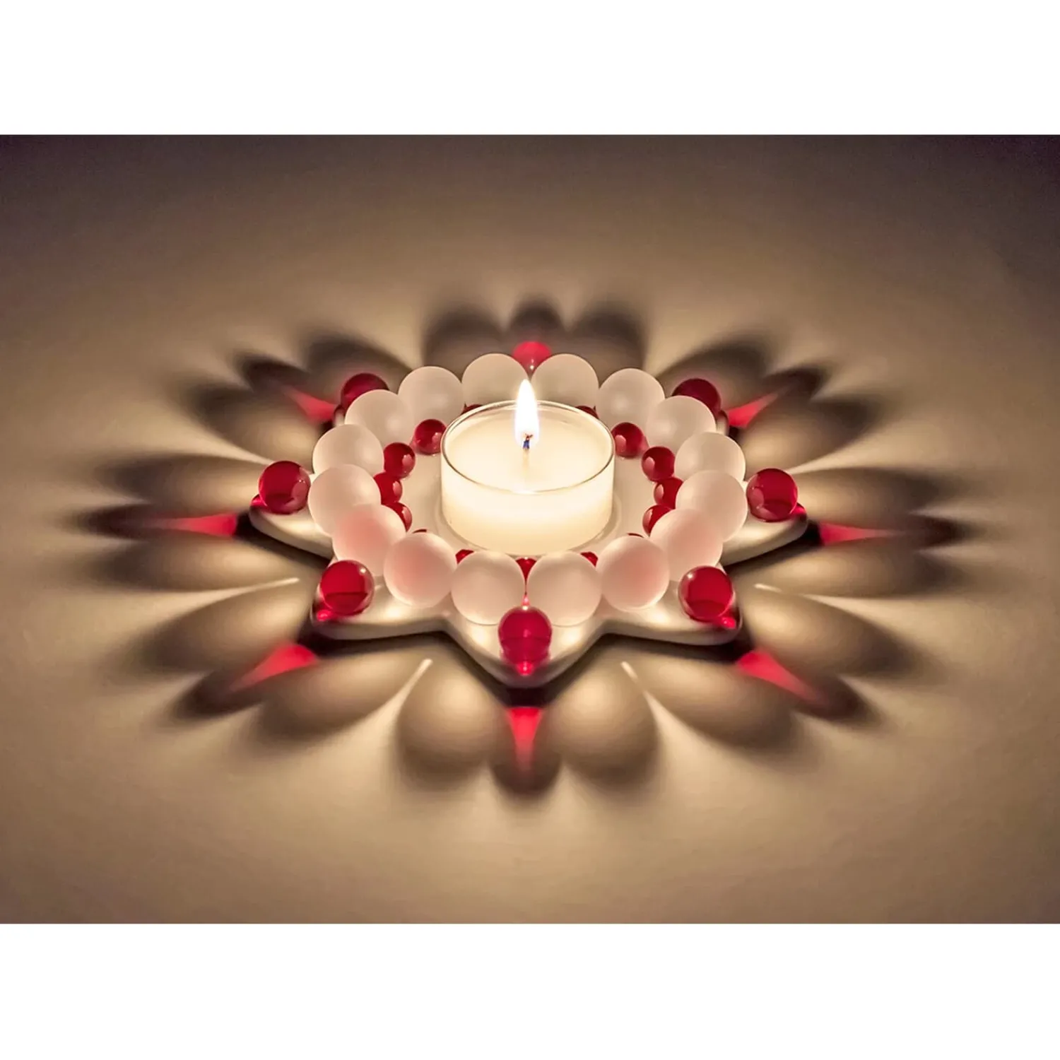 Wird ein Teelicht entzündet, entfaltet der Stern seine wahre Magie: Die transparenten und matten Perlen brechen das Licht auf zauberhafte Weise und tauchen die Umgebung in ein warmes Spiel aus Farbe, Glanz und Schatten. So entsteht eine stimmungsvolle Atmosphäre, die Geborgenheit und Weihnachtsfreude ausstrahlt.