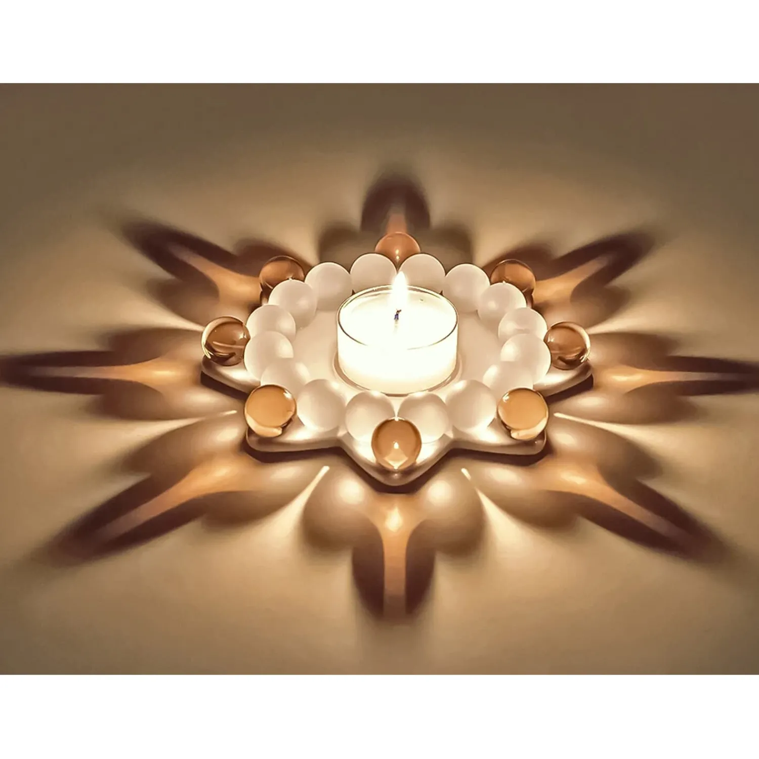 Hergestellt in Dresden, der Wiege der sächsischen Porzellankunst, besteht dieser besondere Teelichthalter aus feinstem Freiberger Porzellan mit edlem Echtgold-Dekor. Umgeben ist das Zentrum von 16 mattweißen Kristallglas-Perlen und acht farbintensiven Böhmischen Glasperlen – jede einzelne handgefertigt und sorgfältig eingesetzt.