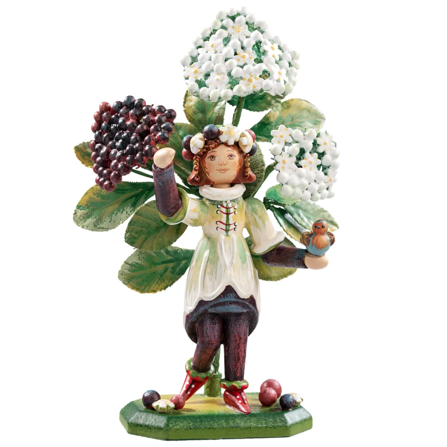 Wenn der Frühling geht und der Sommer kommt hat die Blüte des Holunders ihren großen Auftritt. Spät im Sommer sind die purpurfarbenen Beeren ein willkommenes Futter für die heimischen Vögel. Die Begeisterung für den Holunderstrauch ist in unserer grazilen Figur eingefangen.