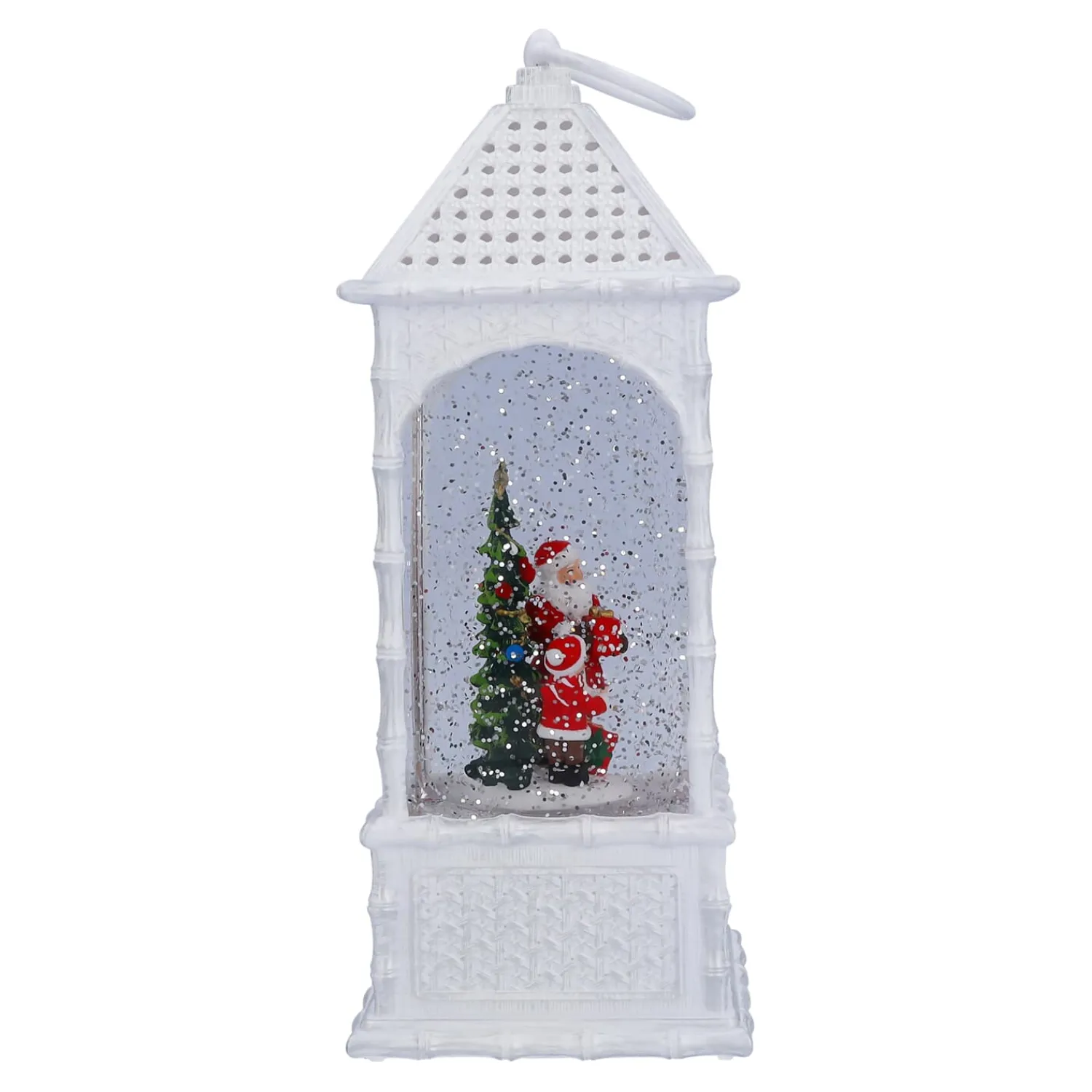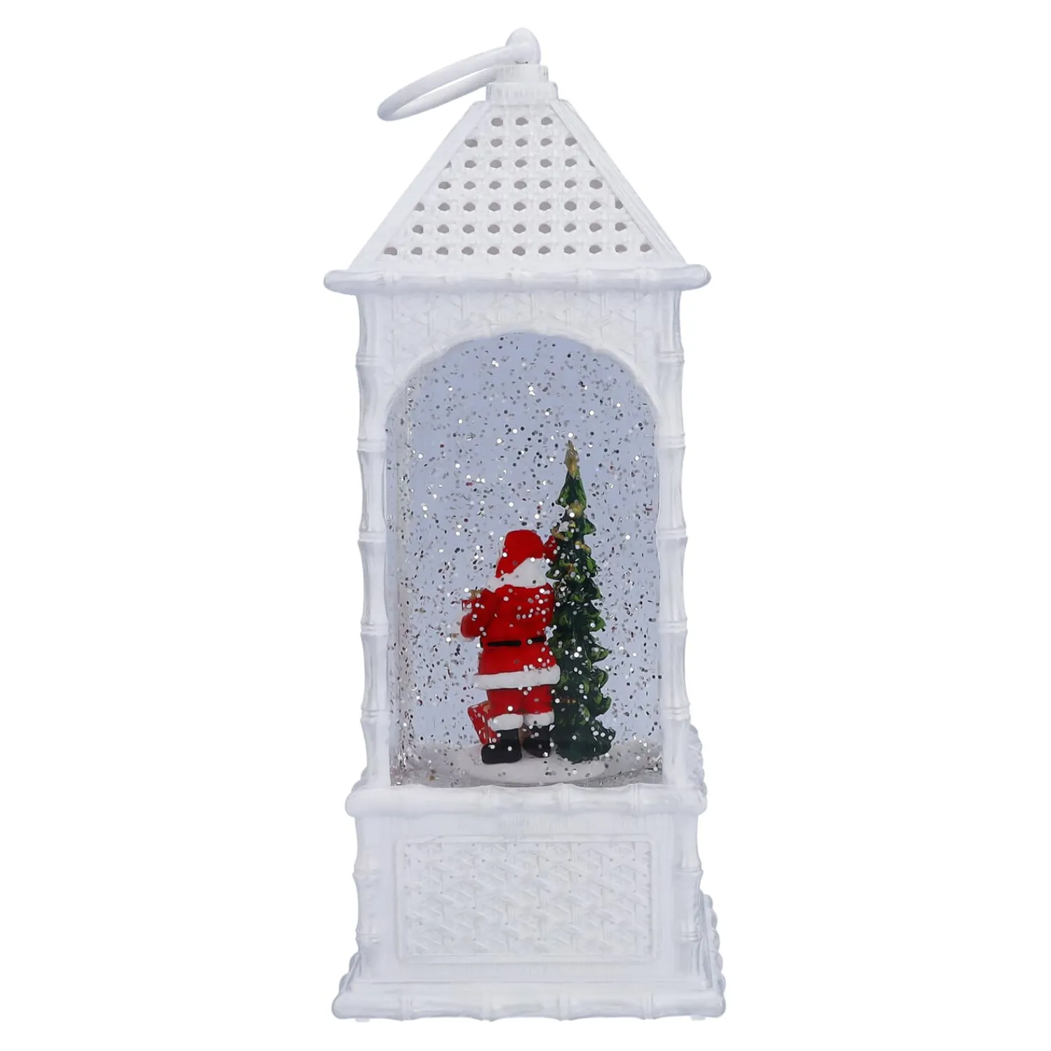 Diese wassergefüllte LED-Laterne aus Kunststoff und Plexiglas bringt mit ihrem automatischen Schneegestöber eine zauberhafte Winterwelt in Ihr Zuhause. In der funkelnden Schneelandschaft überreicht der Weihnachtsmann einem Kind ein Geschenk, während ein festlich geschmückter Baum die Szene erhellt. Die warmweiße LED-Beleuchtung und die sanft wirbelnden Schneeflocken machen diese Laterne zu einem wunderschönen Highlight für Ihre Weihnachtsdekoration, die festliche Magie verbreitet.