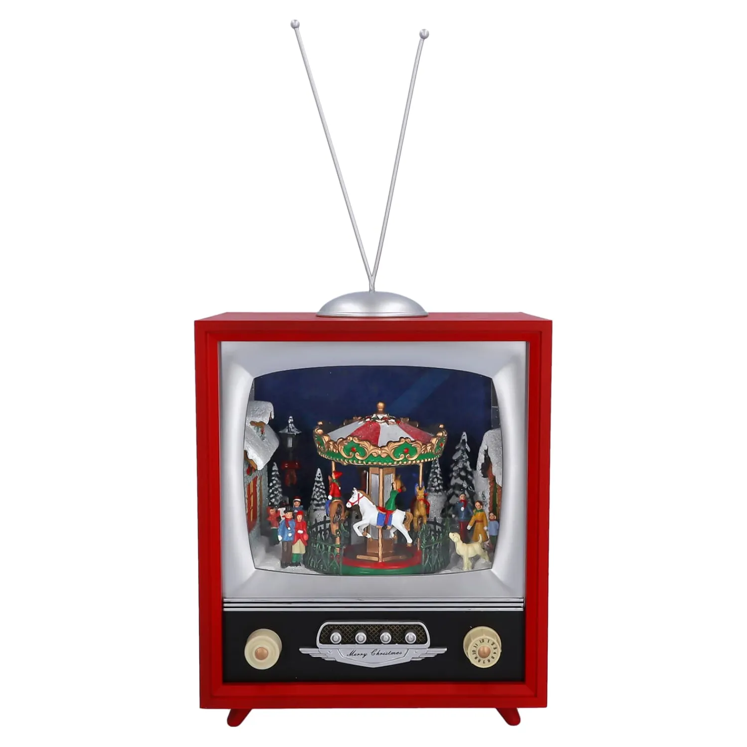 Tauchen Sie ein in eine Weihnachtswelt voller Nostalgie und Magie! Dieser bezaubernde Retro-Fernseher lässt Erinnerungen an vergangene Zeiten aufleben und entführt Sie in eine verträumte Winterlandschaft. In seinem Inneren dreht sich ein prachtvoll verziertes Karussell, während sanftes Licht die Szenerie in festlichen Glanz taucht. Begleitet von 8 stimmungsvollen Weihnachtsmelodien wird dieses detailverliebte Dekorationselement zum strahlenden Mittelpunkt jeder Weihnachtsdekoration. Ein wahres Highlight für alle, die den Zauber der Festtage in stilvoller Nostalgie genießen möchten!