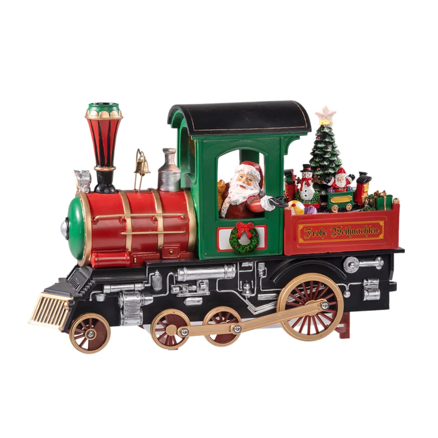 Mit dampfender Nostalgie und weihnachtlichem Glanz rollt diese festlich geschmückte Lok direkt ins Herz. Liebevoll aus Kunstharz gefertigt, vereint sie detailreiche Gestaltung mit stimmungsvoller Beleuchtung und zaubert eine kleine Winterwelt auf ihren Waggon: Während sich auf der Ladefläche ein Miniaturzug im Kreis dreht, setzen sich auch die Räder der Lok in Bewegung – begleitet von acht festlichen Weihnachtsmelodien.