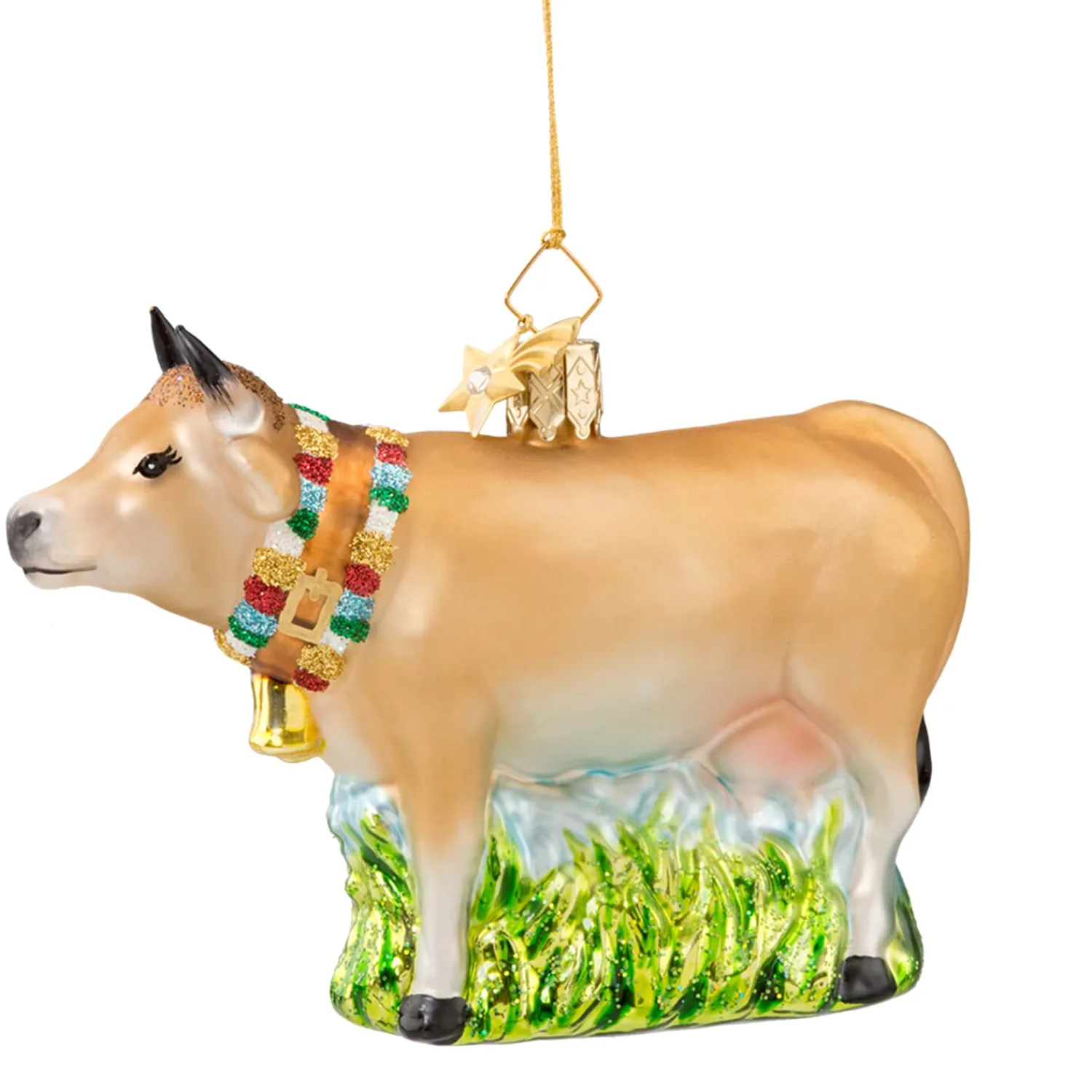 Was bimmelt denn da von fern? Die Weide scheint völlig leer zu sein. Doch schaut man genau hin sieht man sie hinter dem Hügel grasen: Die Kuh. Mit ihrem hellbraunen Fell steht sie da und trägt eine große, goldene Glock mit einem bunten, weihnachtlichen Band um den Hals.