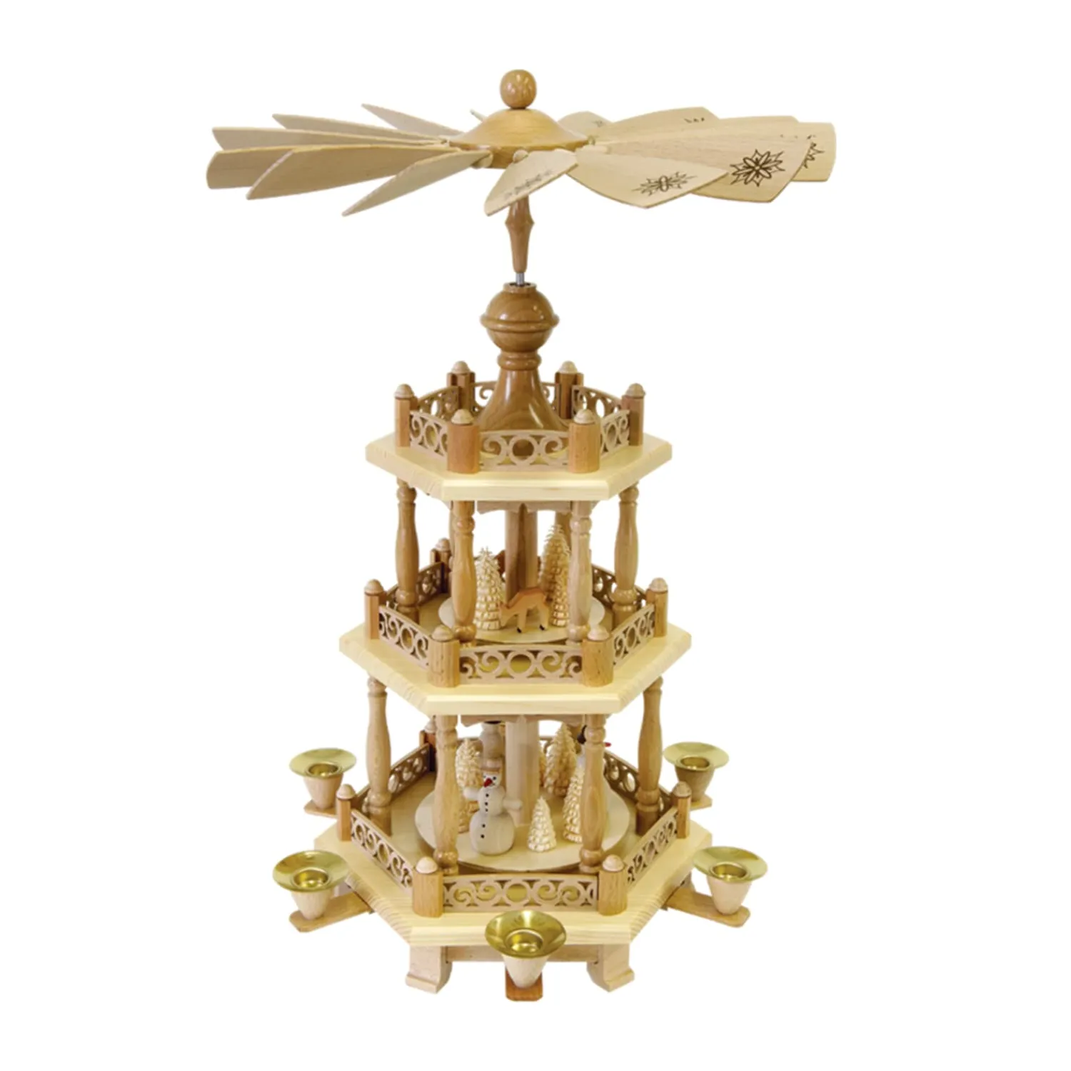 Eine der schönsten Weihnachtstraditionen sind Pyramiden und die Geschichten die sie erzählen. Das durch Kerzenwärme angetriebene Flügelrad zaubert ein wunderbares Spiel aus Licht und Schatten an Decken und Wände.