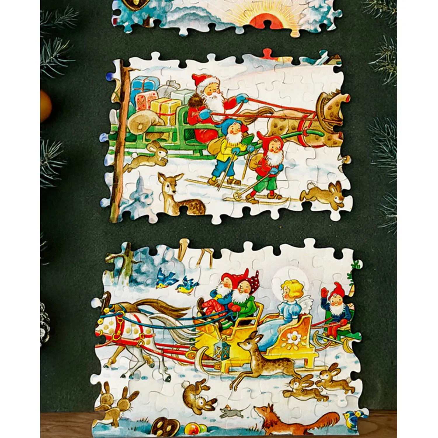 Wenn der Weihnachtsmann, das Christkind und zahlreiche Wichtel durch die verschneite Winterlandschaft ziehen, versammeln sich Tiere und Zuschauer am Wegesrand – und Sie sind mitten im Geschehen. Mit jedem Türchen des Puzzle-Adventskalenders wächst das nostalgische Gesamtbild Tag für Tag weiter, bis es in seiner ganzen festlichen Pracht erstrahlt.