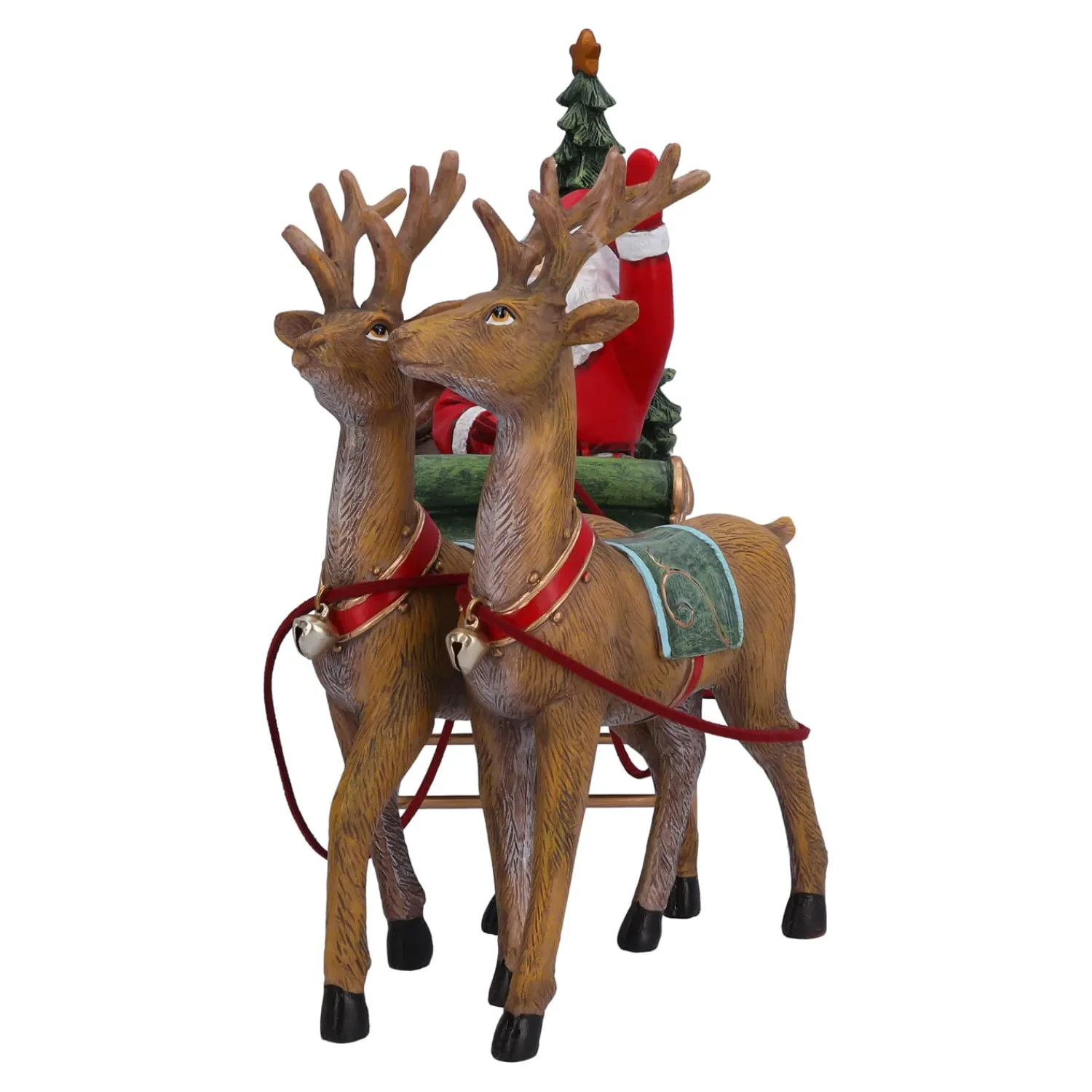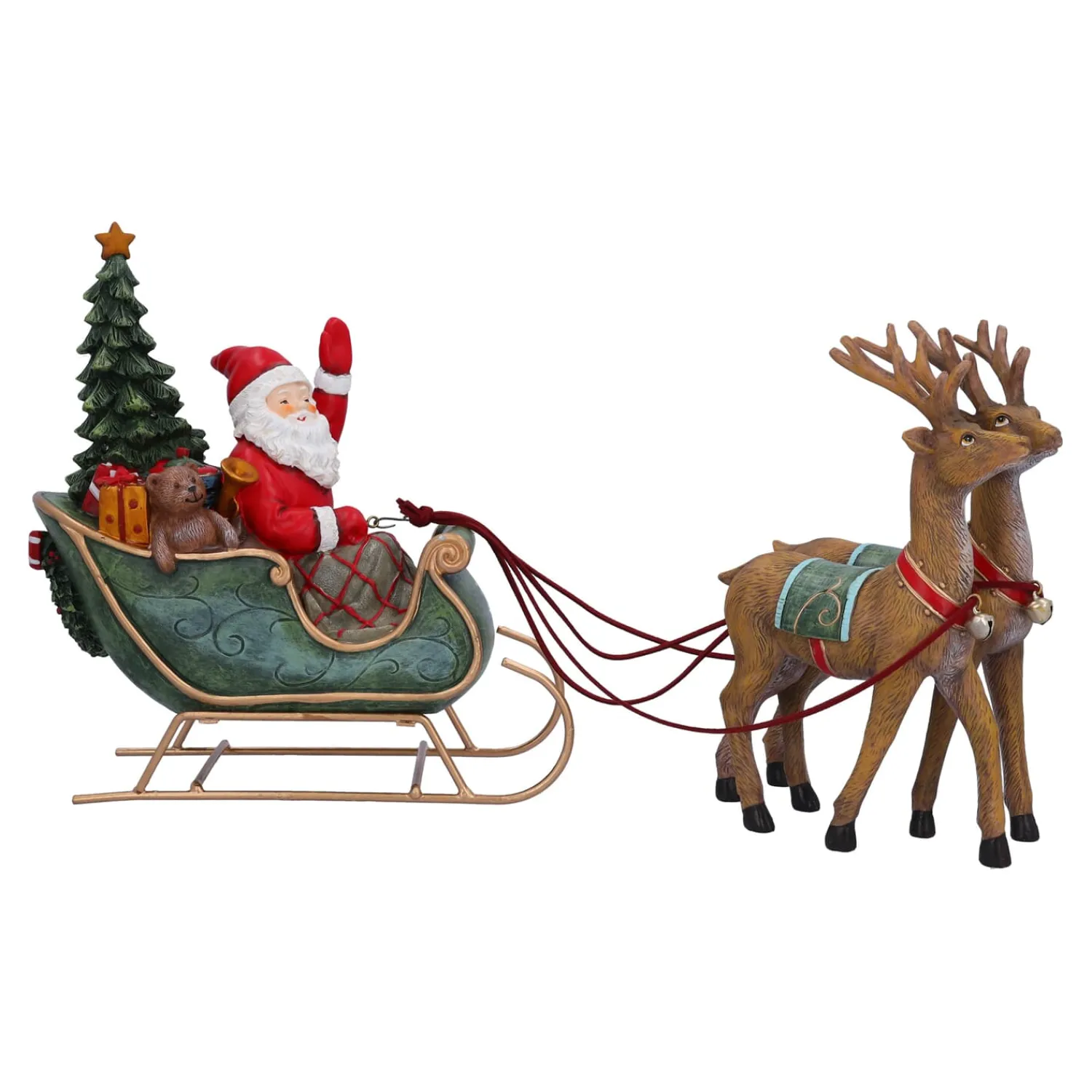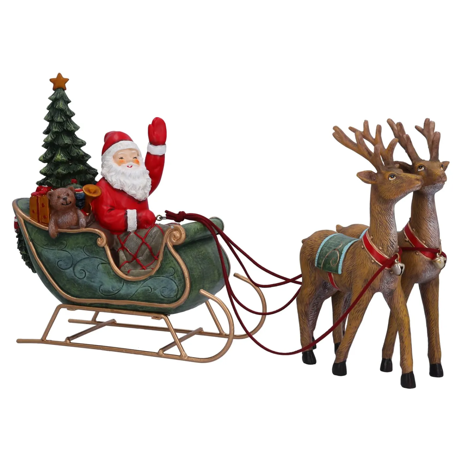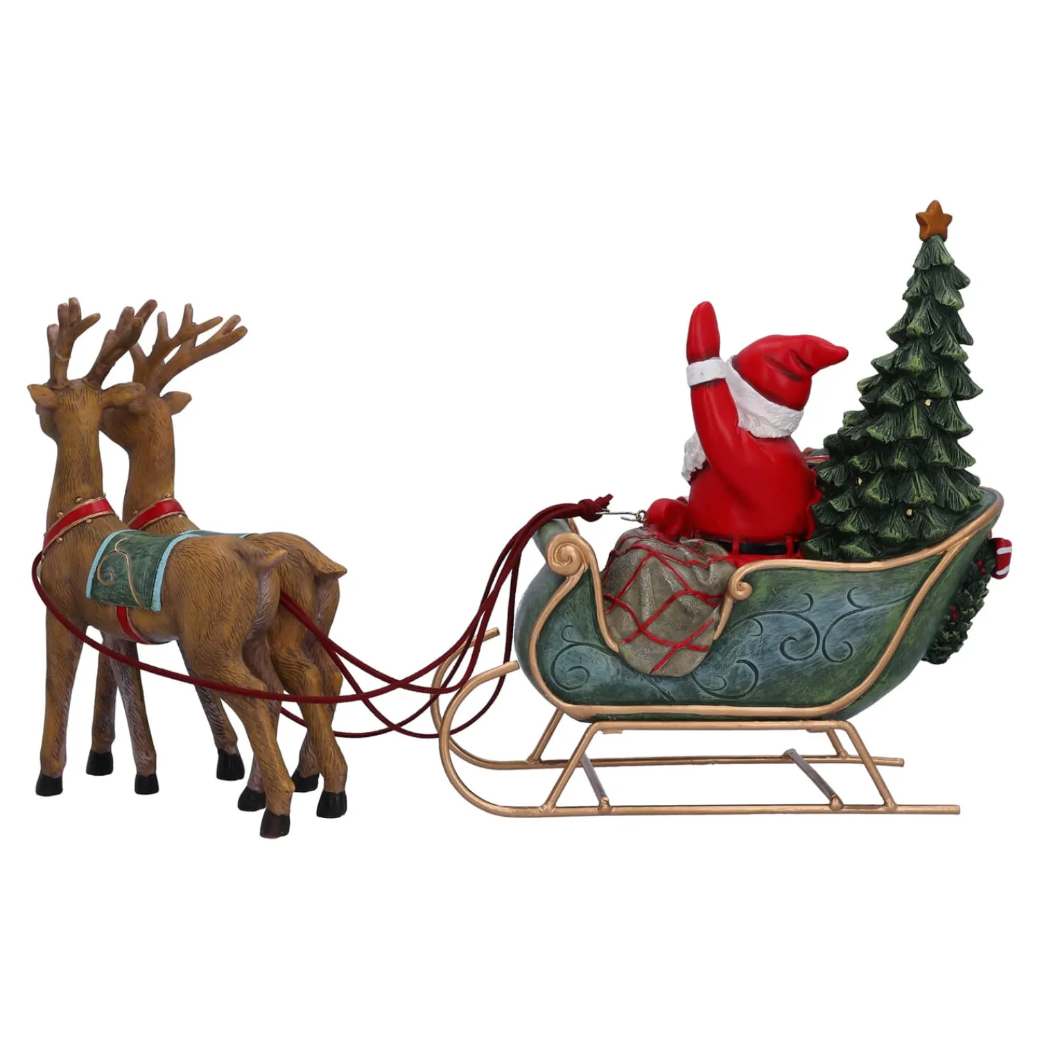 Mit seinem festlichen Schlitten, voll beladen mit Geschenken, zaubert der Weihnachtsmann ein Lächeln auf die Gesichter aller, die ihn erblicken. Diese magische Figur bringt den Zauber der Weihnacht direkt in Ihr Zuhause und erinnert uns an die besonderen Momente, wenn der Weihnachtsmann um die Welt reist, um Geschenke zu verteilen.