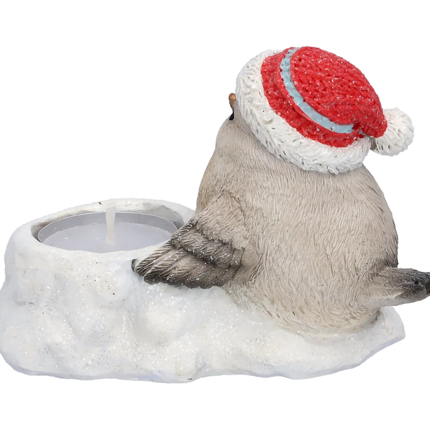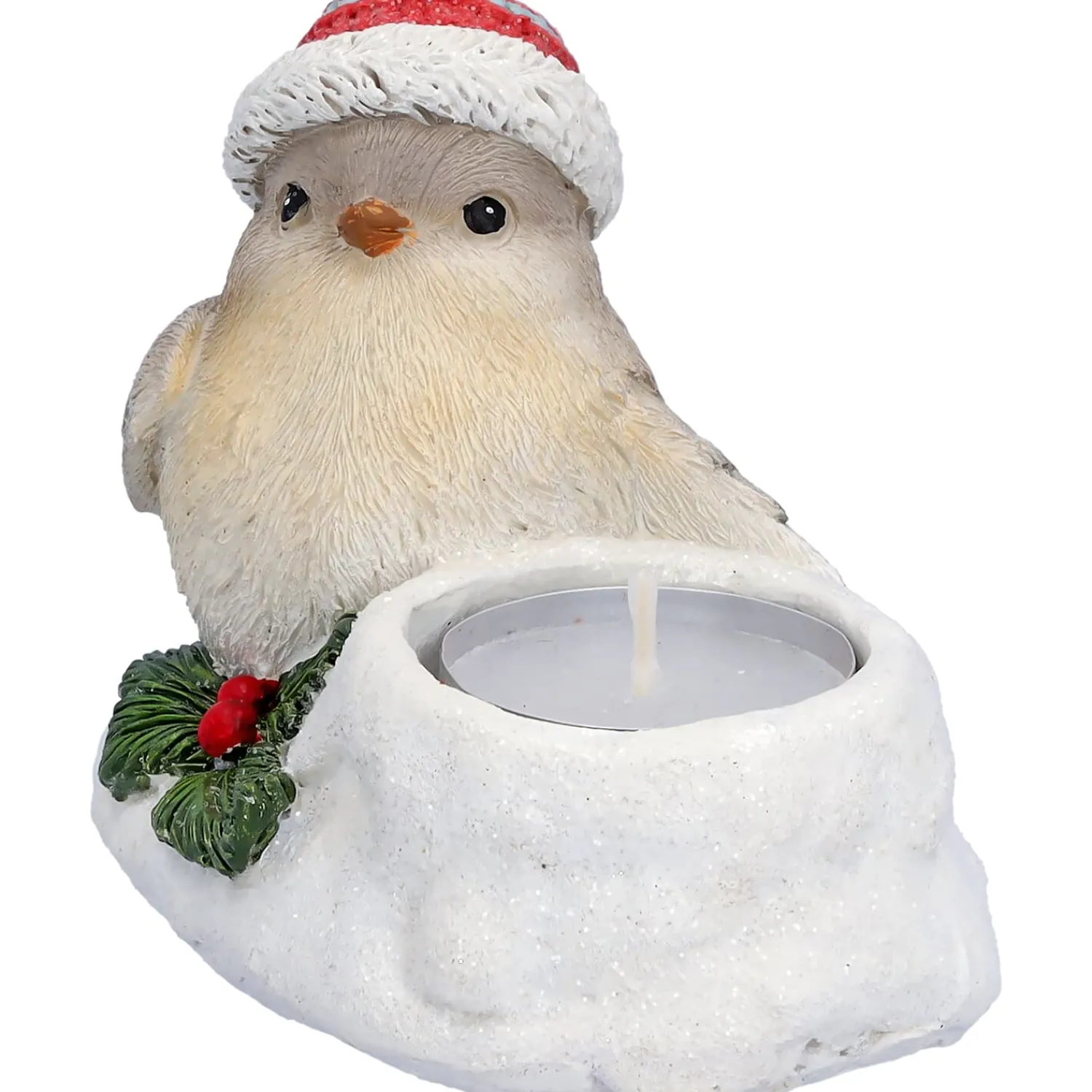 Teelichthalter aus Kunstharz, Vogel mit roter Mütze
