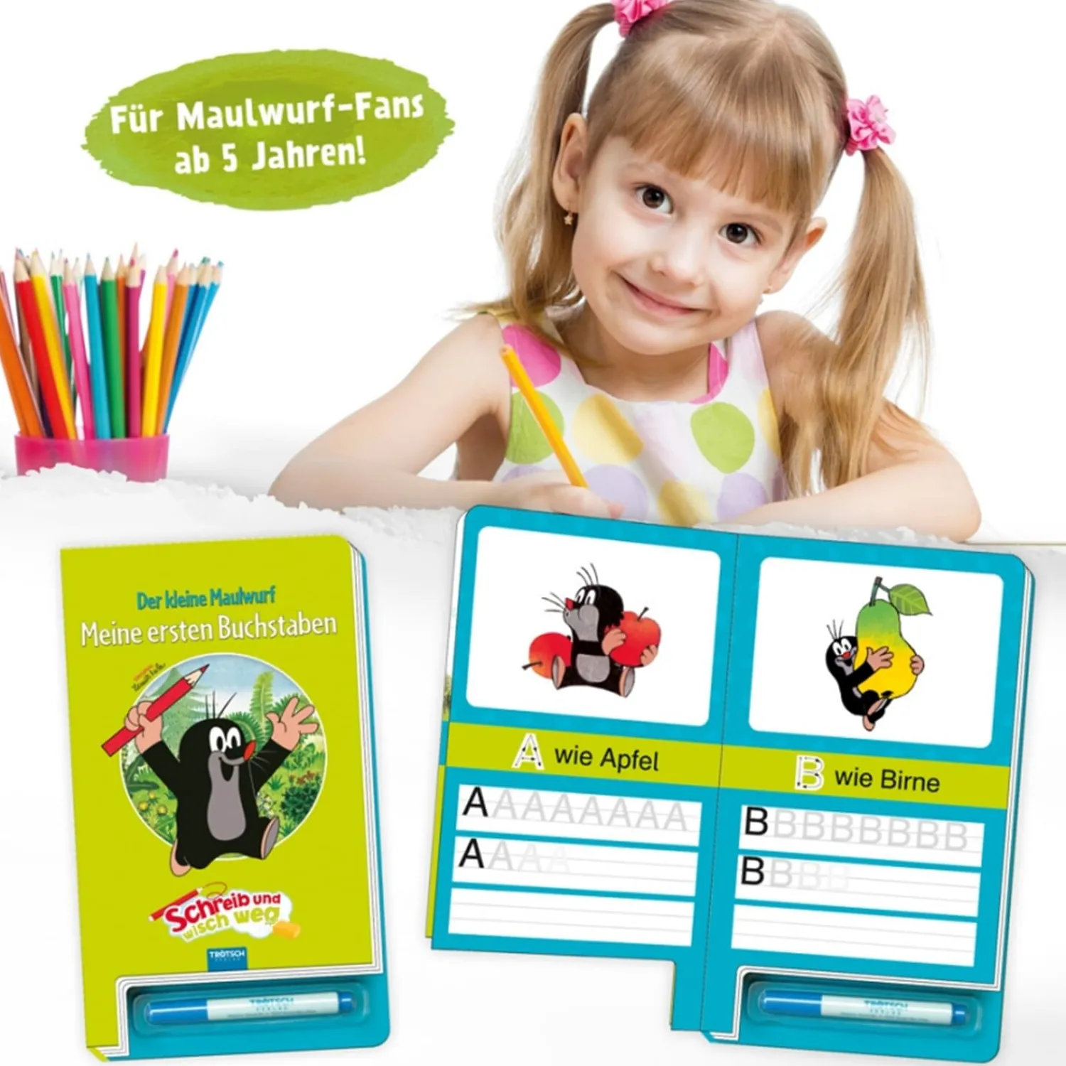 Dieses „Schreib und wisch weg“-Buch mit dem kleinen Maulwurf hilft beim Erlernen und Üben der Buchstaben.