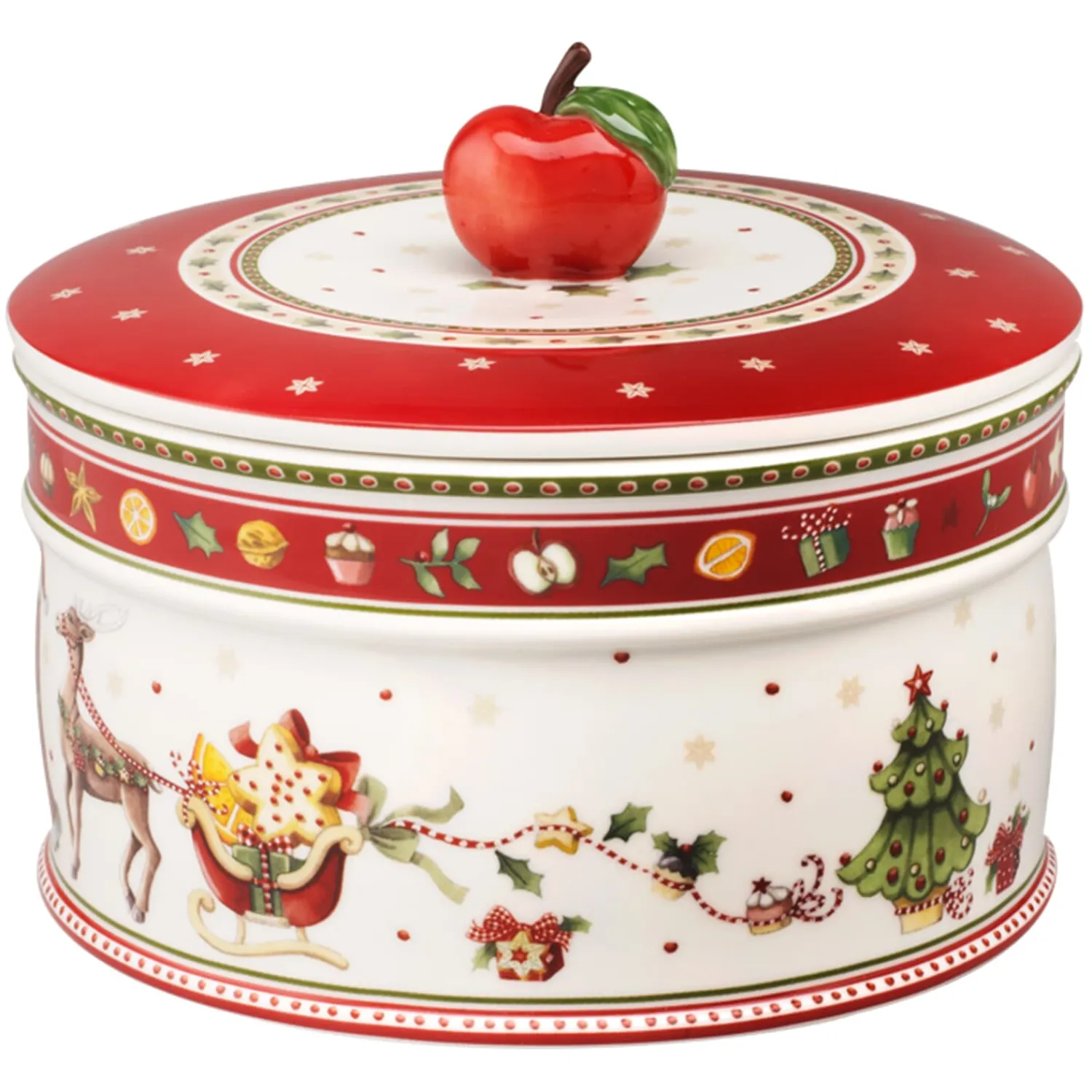 Was wäre Weihnachten ohne den Duft frisch gebackener Plätzchen? Diese liebevoll gestaltete Gebäckdose aus der Serie Winter Bakery Delight ist wie gemacht für süße Schätze aus der Weihnachtsbäckerei. In ihrem Inneren lassen sich Vanillekipferl, Zimtsterne oder Lebkuchen stilvoll und aromageschützt aufbewahren – bereit für gemütliche Nachmittage und festliche Genussmomente. Der detailreiche Rentierschlitten und die weihnachtlichen Motive auf der Dose weckt Erinnerungen an kindliche Vorfreude, während der Deckel mit rotem Apfelgriff einen charmanten Akzent setzt. Ein echtes Herzensstück, das nicht nur in der Weihnachtsküche für Freude sorgt, sondern auch als kleines Geschenk wundervolle Botschaften überbringt.