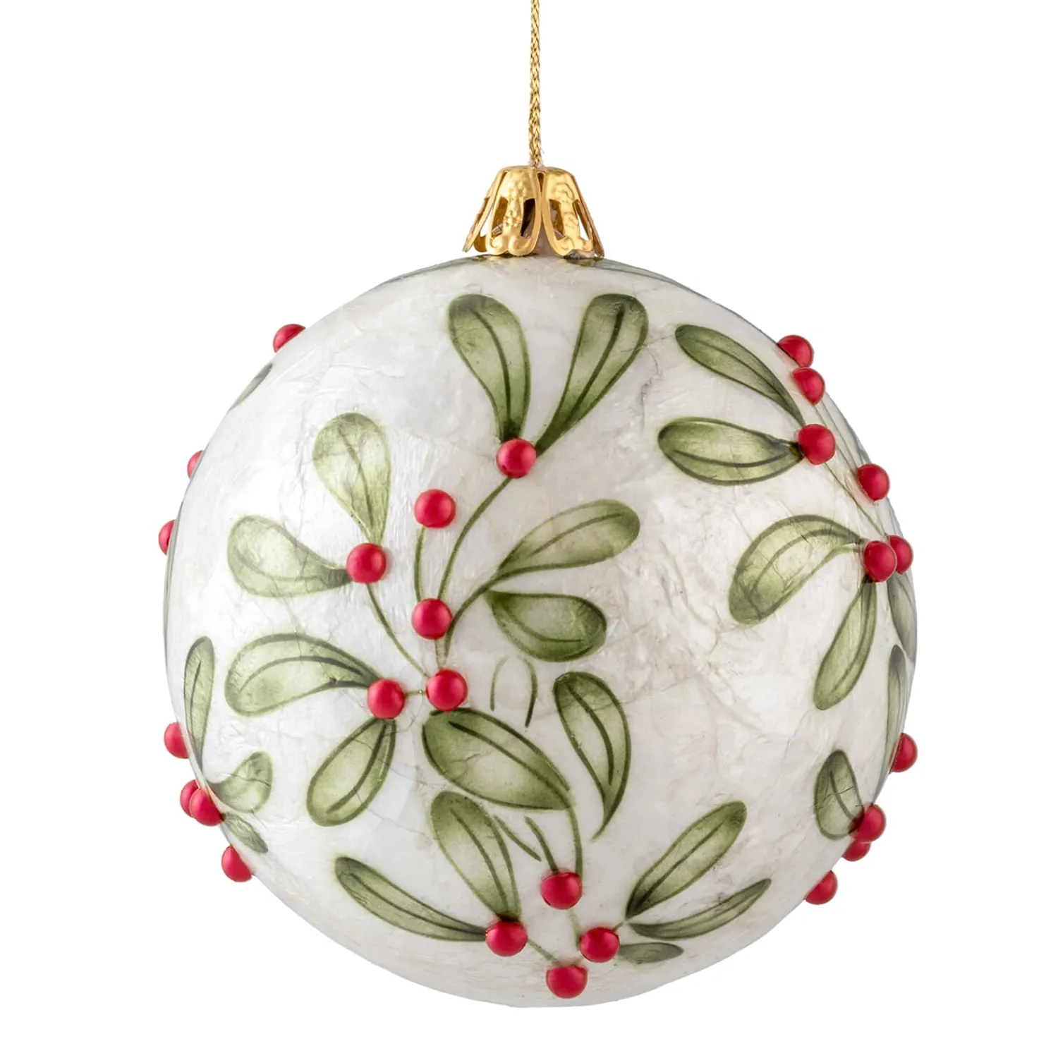 Fein schimmerndes Perlmutt, zarte Mistelzweige und leuchtend rote Beeren – diese Kugel verzaubert mit ihrer schlichten Schönheit und festlichen Symbolkraft. Die erhabenen Details verleihen ihr eine besondere Tiefe, während das sanfte Glanzspiel des Perlmutts eine ruhige, fast magische Stimmung entfaltet.