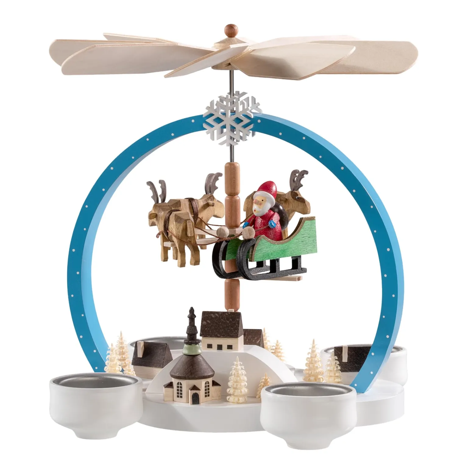 Eine der schönsten Weihnachtstraditionen sind Pyramiden und die Geschichten die sie erzählen. Das durch Kerzenwärme angetriebene Flügelrad zaubert ein wunderbares Spiel aus Licht und Schatten an Decken und Wände.